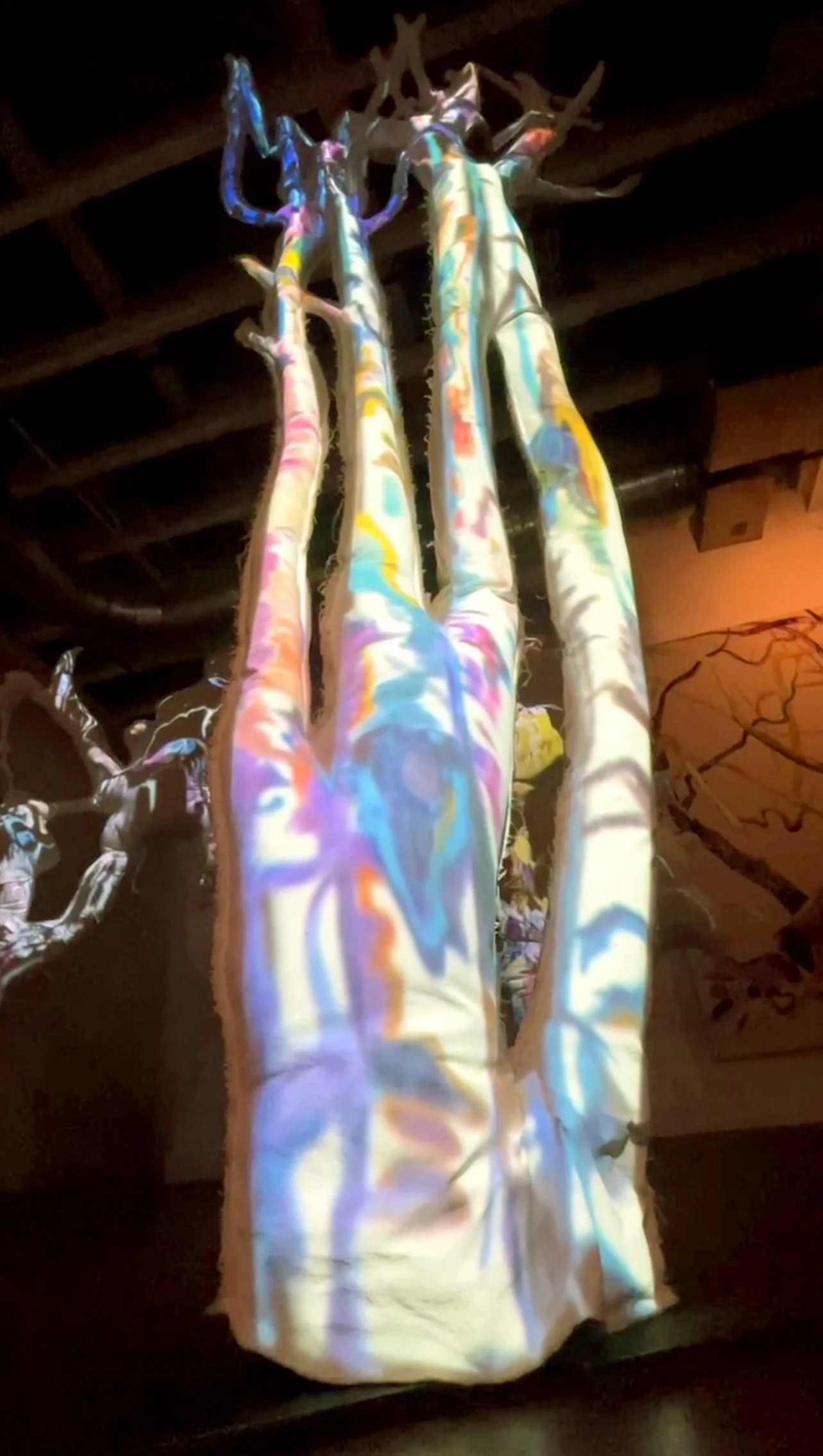 Ghost of Birch Entanglement, canvas, steel, polyfill, animated painted projections, 84 x 33 x 8 inches, 2022-2024