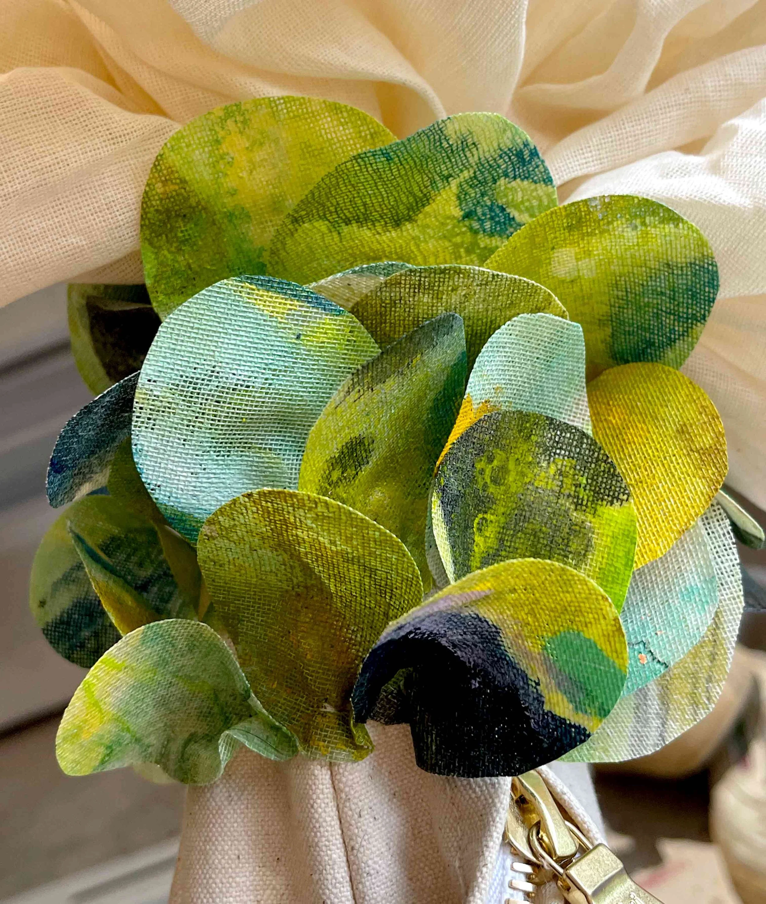 Fish Crone, acrylic on canvas, polypill, zippers, video monitors, blown glass, birch ply, wire, mohair, beads, 36 x 84 x 44 inches, 2022-2024