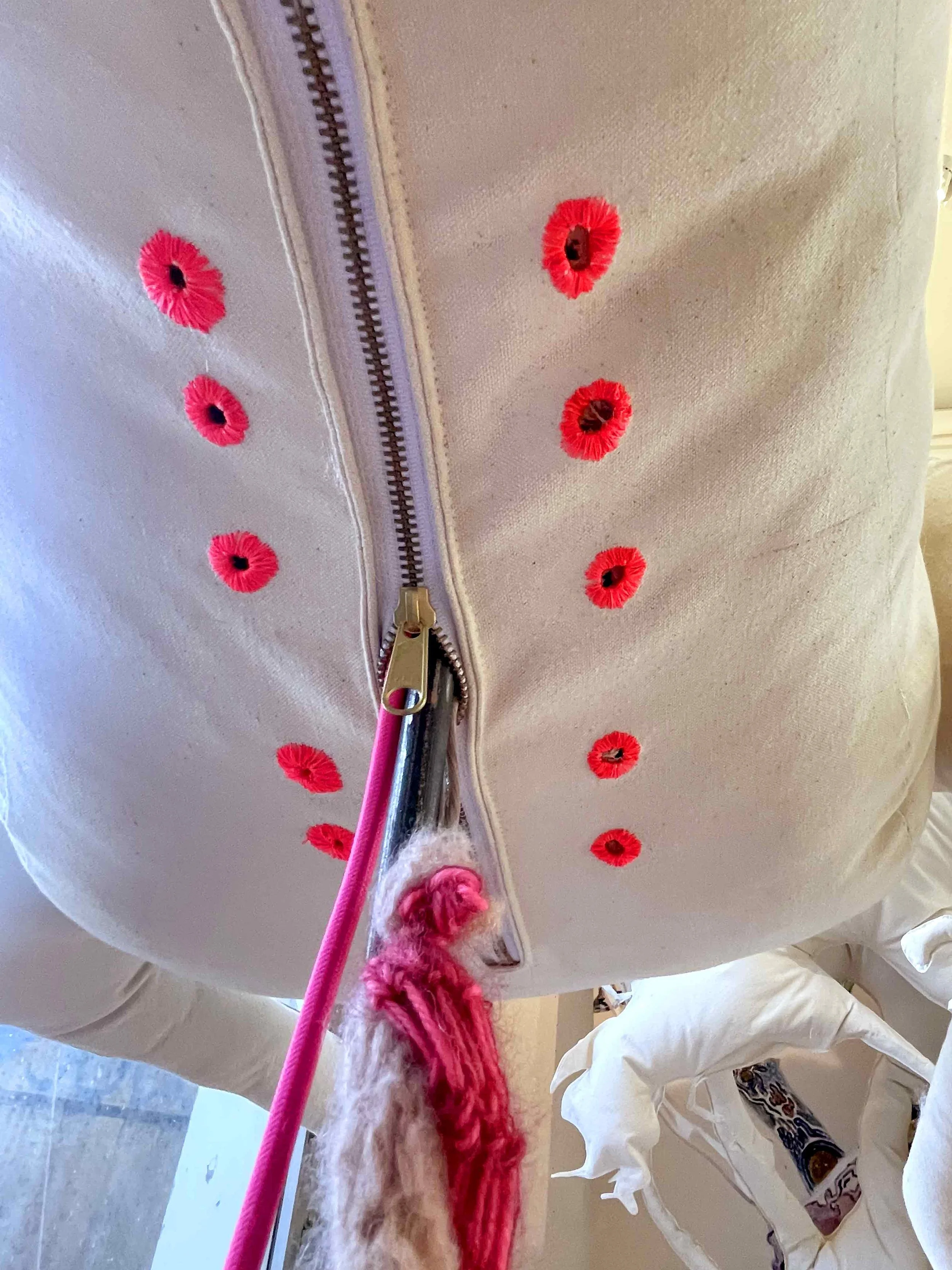 Stag, acrylic on canvas, polyfill, cedar branches, steel, video monitors, pink LED light bulbs, paint rags, bone buttons, whittled sticks, string from decades of painting badminton court lines for the artist’s children, gold leaf, silk velvet, yarn, wire, crochet, projections of artist’s dogs’ fur, 63 x 30 x 60 inches, 2022-2024